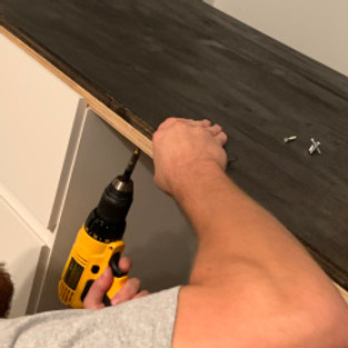 5. Take out your drill and screw directly through the wood cut into the top side of the dresser. I did 6 on each side, three into each side of the dresser and repeated. We used a piece of trim to line up where the dresser ended and figure out where to screw.